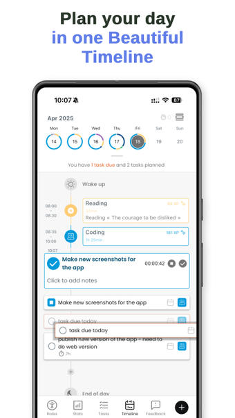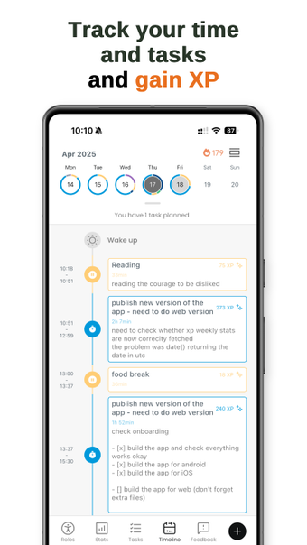 O aplicativo possui um recurso de rastreamento de tempo que permite ver quanto tempo levou para completar uma tarefa específica. Além disso, você também pode atribuir valores de XP personalizados para cada tarefa—o valor depende de você, mas você provavelmente atribuirá recompensas de XP maiores para tarefas mais complicadas. O aplicativo também funciona offline, permitindo que você complete suas tarefas ou “missões” em qualquer lugar sem se preocupar em perder a conexão com a internet.